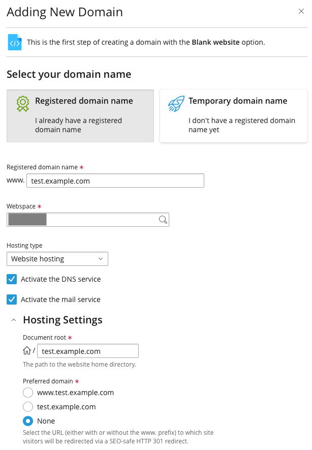 Im Normalfall können Sie hier eine registrierte Domain verwenden. Vorausgesetzt, Sie haben diese bereits gekauft.
